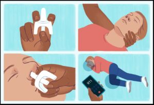 - If breathing doesn’t return, start rescue breathing: Tilt head back, pinch nose, and give one breath every 5 seconds.